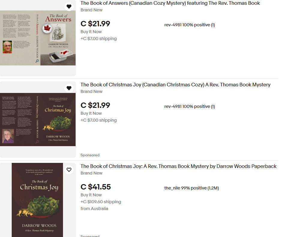 My browser page feeds me a curated selection of things it “thinks” will interest me. This week I began to see Ebay ads for my most recent mystery, The Book of Christmas Joy.
